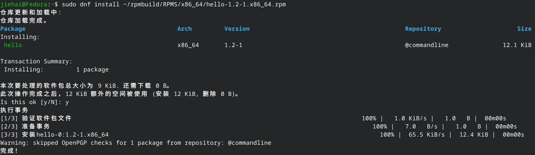 我的 cpu 是 x86_64,不出意外的话,rpm包会存放在 ~/rpmbuild/RPMS/x86_64/hello-1.2-1.x86_64.rpm,这样就已经打包好了,可以使用 sudo dnf install 进行安装。